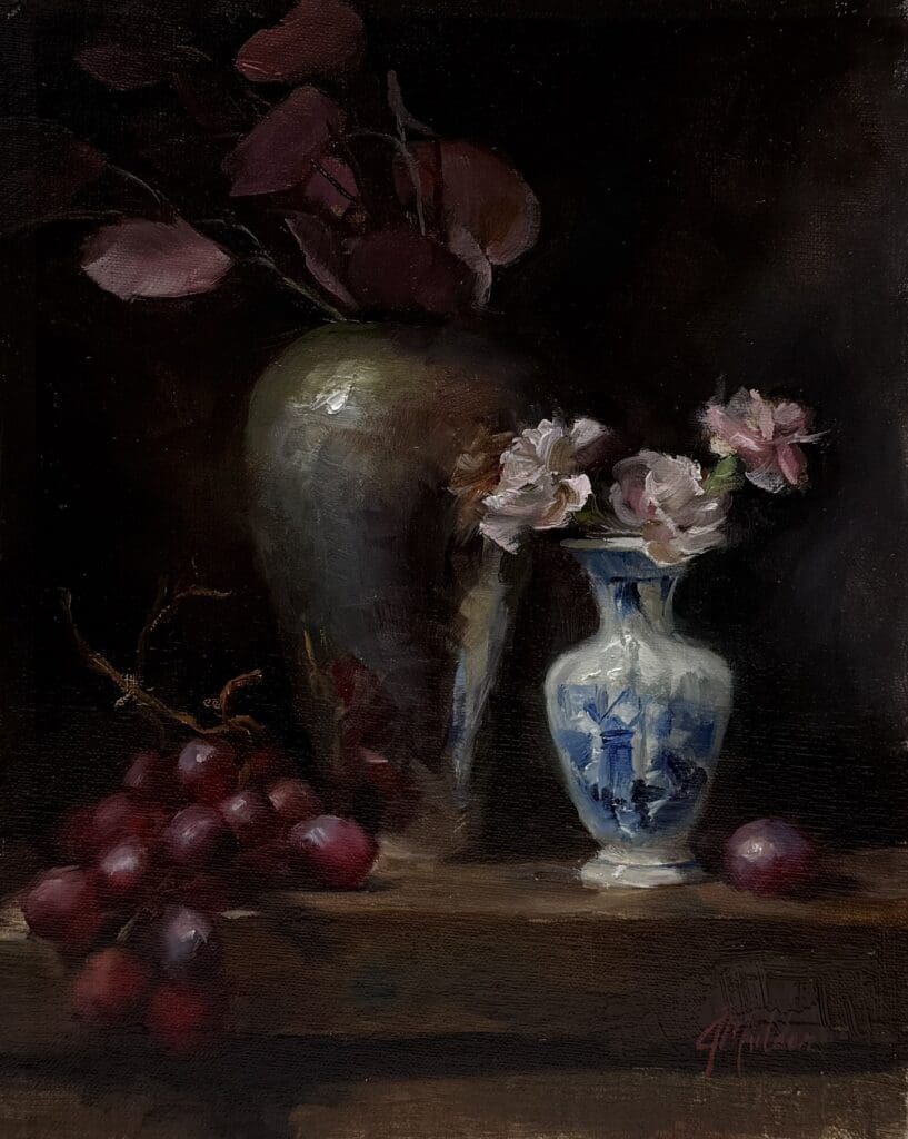| Jill Ellen Mulder | Wyoming MI | Silver and Delft Vase with Pink Carnations | 10" x 8" | $600 |